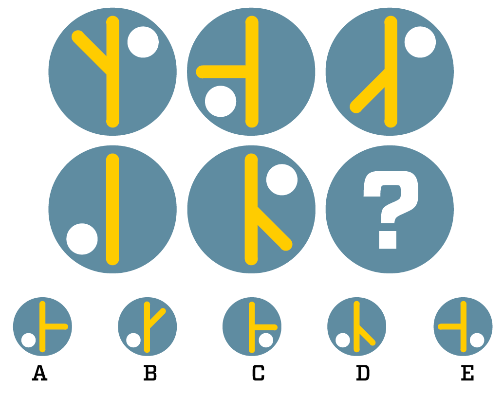 Mikä kuvioista A–E kuuluu sarjaan seuraavaksi kysymysmerkin paikalle?