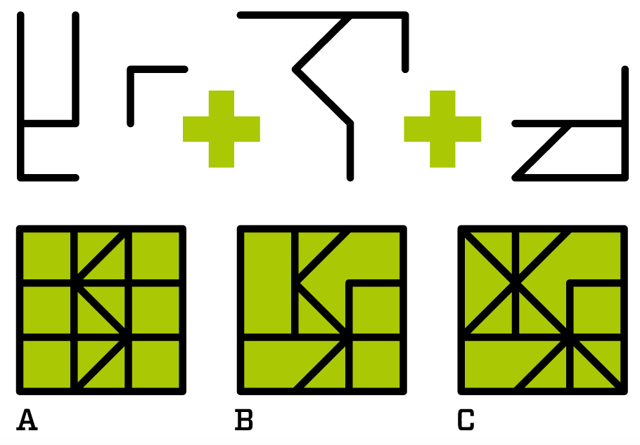 Mikä neliöistä A–C muodostuu, kun alla olevat kuviot liitetään yhteen?